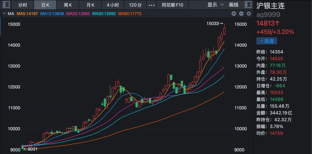 12月12日,国内期货市场沪金、沪银飘红。截至上午收盘,沪金主力合约2602报涨近1%,收于964.7元/克;而沪银大幅上涨3.2%,盘中已击破15000元/千克关口,再度刷新历史新高。