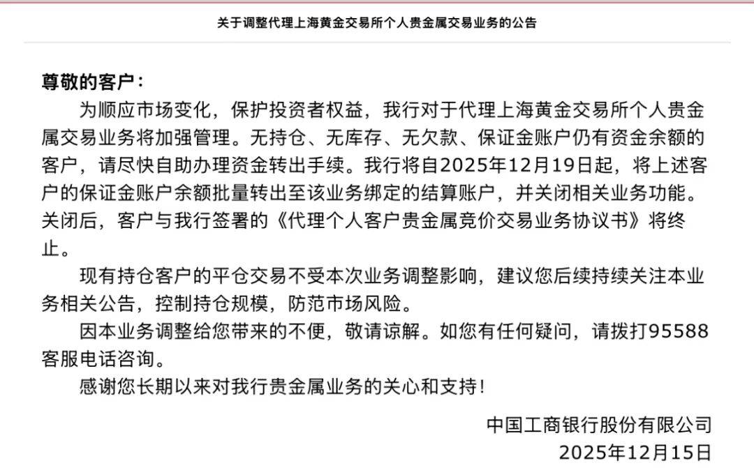 12月15日,工商银行发布公告,对于代理上海黄金交易所个人贵金属交易业务将加强管理。工行提示,无持仓、无库存、无欠款、保证金账户仍有资金余额的客户,尽快自助办理资金转出手续。工行将自2025年12月19日起,将上述客户的保证金账户余额批量转出至该业务绑定的结算账户,并关闭相关业务功能。关闭后,客户与工行签署的《代理个人客户贵金属竞价交易业务协议书》将终止。