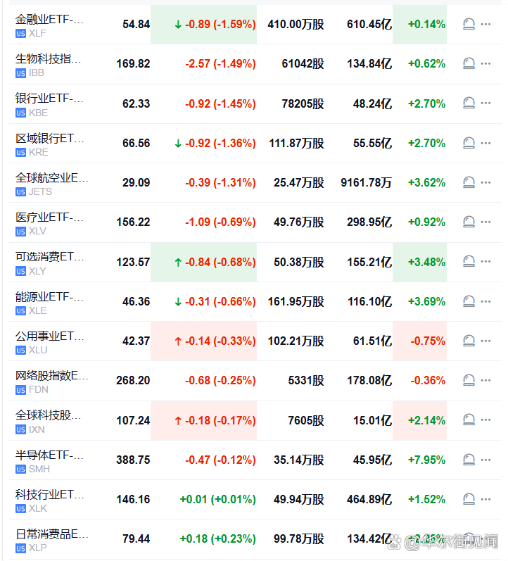 【行业ETF美股盘初普跌】金融业ETF跌1.59%,生物科技指数ETF跌1.49%,银行业ETF跌1.45%,区域银行ETF跌1.36%,网络股指数ETF跌0.25%,全球科技股指数ETF跌0.17%,半导体ETF跌0.12%,科技行业ETF涨0.01%。