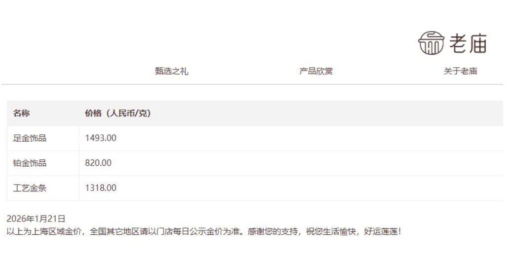 老庙黄金官网发布数据显示,足金饰品报1493元/克,较1月20日1455元/克涨38元/克。