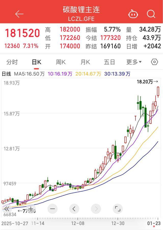 1月23日,碳酸锂市场延续强势上行态势,碳酸锂期货主力合约盘中拉升超7%,一举突破18万元/吨整数关口,截至收盘报181520元/吨,市场交投活跃度显著提升。