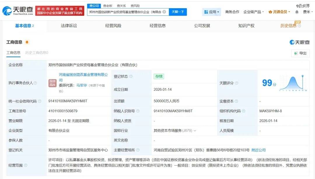 投资界1月23日消息,天眼查显示,近日,郑州市国创战新产业投资母基金管理合伙企业(有限合伙)注册成立,执行事务合伙人为河南省国创混改基金管理有限公司,出资额50亿人民币,经营范围为以私募基金从事股权投资、投资管理、资产管理等活动,创业投资。合伙人信息显示,该基金由河南省国创混改基金管理有限公司(认缴出资100万元)、郑州产业投资集团有限公司共同出资(认缴出资49.99亿元)。