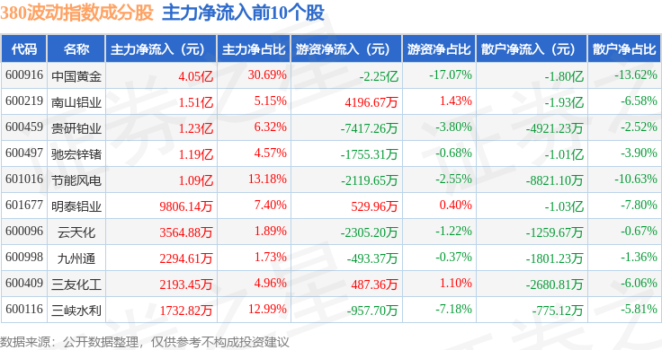 资金流向方面,380波动(000130)指数成份股当日主力资金净流入合计2.3亿元,游资资金净流出合计5.72亿元,散户资金净流入合计3.42亿元。成份股资金流向详情见下表: