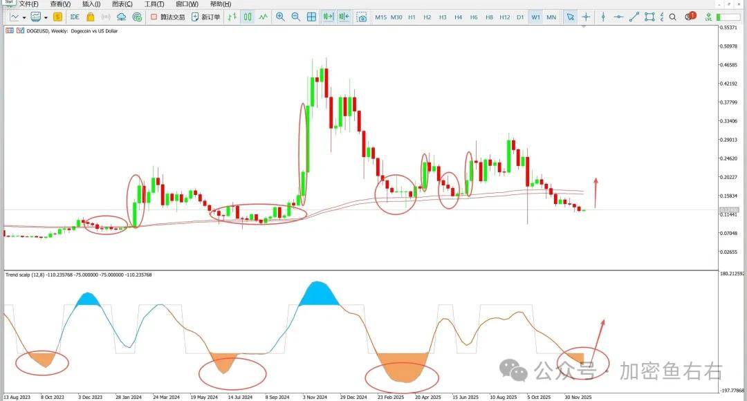 目前来看是个弱狗,但是狗狗币的特点就是这样,很多时候,其他币都在拉升它还在震荡,大多数时候,狗狗币的拉升就是一两根周k先就走完了,所以这种币更磨人,更需要耐心。