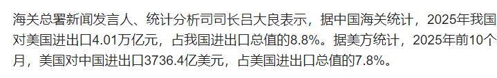 2025年中国对美国进出口总额是4.01万亿元,占咱们全国进出口总值的8.8%;美方那边的数据也差不多,前10个月对中国进出口3736.4亿美元,占他们总进出口的7.8%。