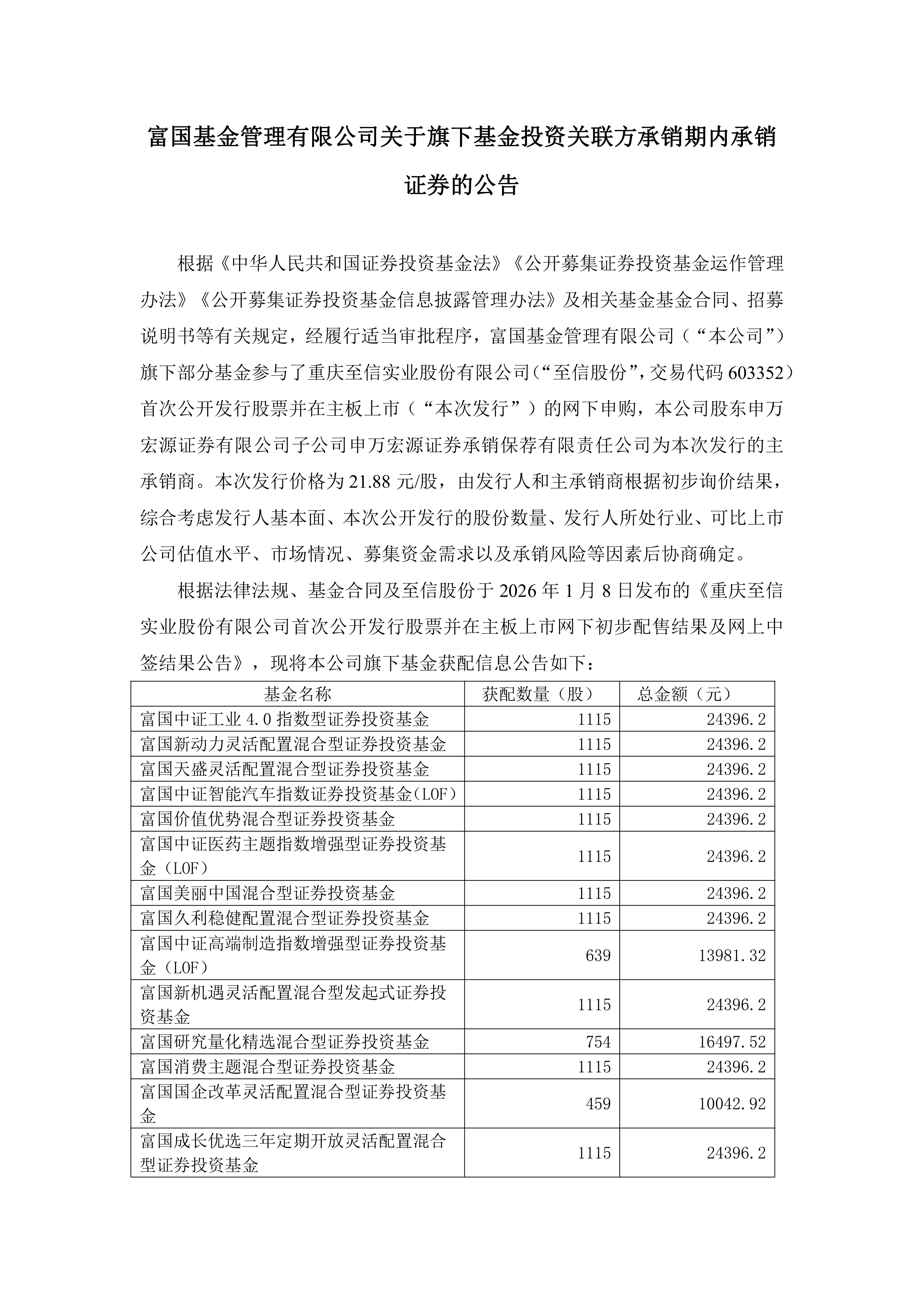 基金-工业40LOF-富国基金管理有限公司关于旗下基金投资关联方承销期内承销证券的公告
