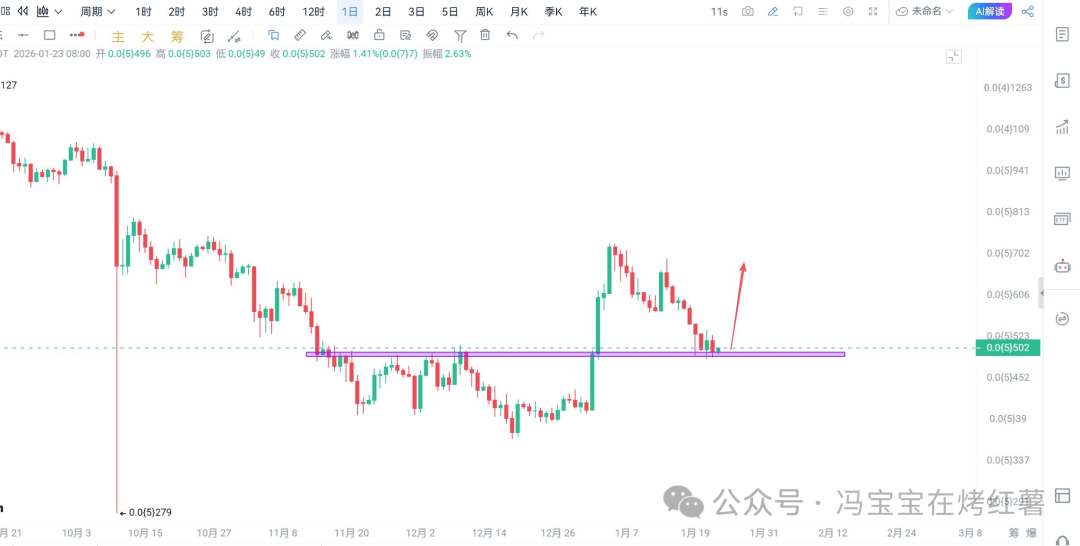 DASH向来跟着日线EMA21均线走,突破后回踩,撑住就反弹,跌破后反抽,碰到就下跌。现在它又快贴近这条均线了,围绕均线,等分时超卖,找个位置多,弹上去看前高,止损放均线之下。