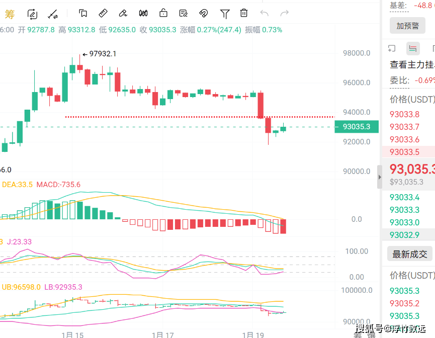 BTC在目前93000美元附近盘整。早盘走了一波快速下跌,直接跌破92000美元关口,最低触及91800美元后开始反弹,日内走小幅横盘震荡。昨日我在文章中也提示过注意变盘风险。日线级别量能还在持续萎缩,KDJ死叉加深,早盘击穿布林中轨后又反弹回去,说明中轨支撑有效,支撑位90000-91000美元,若跌破90000美元关口,则下看可看到86000美元。阻力94000-95000美元。 操作上92000附近可以轻仓多,94000附近轻仓空。ETH目前在3200附近震荡。操作上3150附近轻仓做多,3300附近轻仓空。(切记合约仓位控制在10%以内,带好止损)