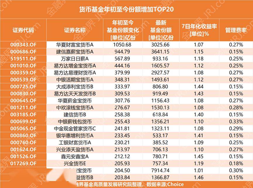 Choice数据显示,不少产品份额增长超过百亿份。截至12月12日,华夏财富宝货币A年内份额增加超过1000亿份,位居榜首;建信嘉薪宝货币A以超944亿份的增幅紧随其后;万家日日薪A增加567亿份,排名第三。观察份额增长前20的货币基金,其7日年化收益率均仍保持在1%以上,其中兴全天添益货币B收益最高,为1.46%。