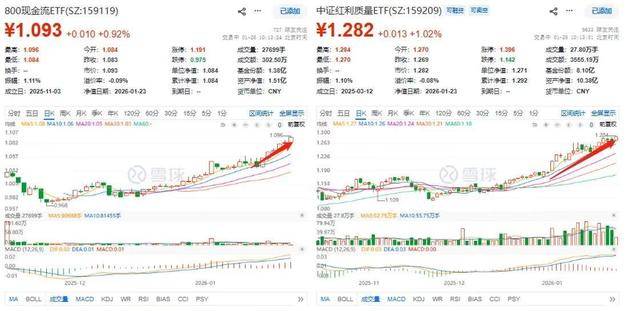 1月26日,“高质量红利”截至10时8分,低费率中证红利质量ETF(159209)、800现金流ETF(159119)分别跌0.87%、0.83%,一度分别涨1.18%、1.20%联袂冲击历史新高。二者持续获资金加仓,分别连续11日、6日净流入!