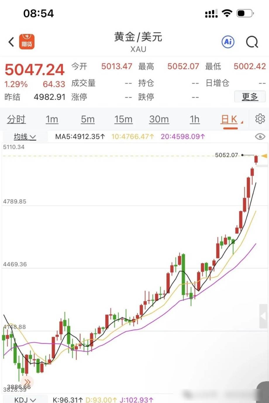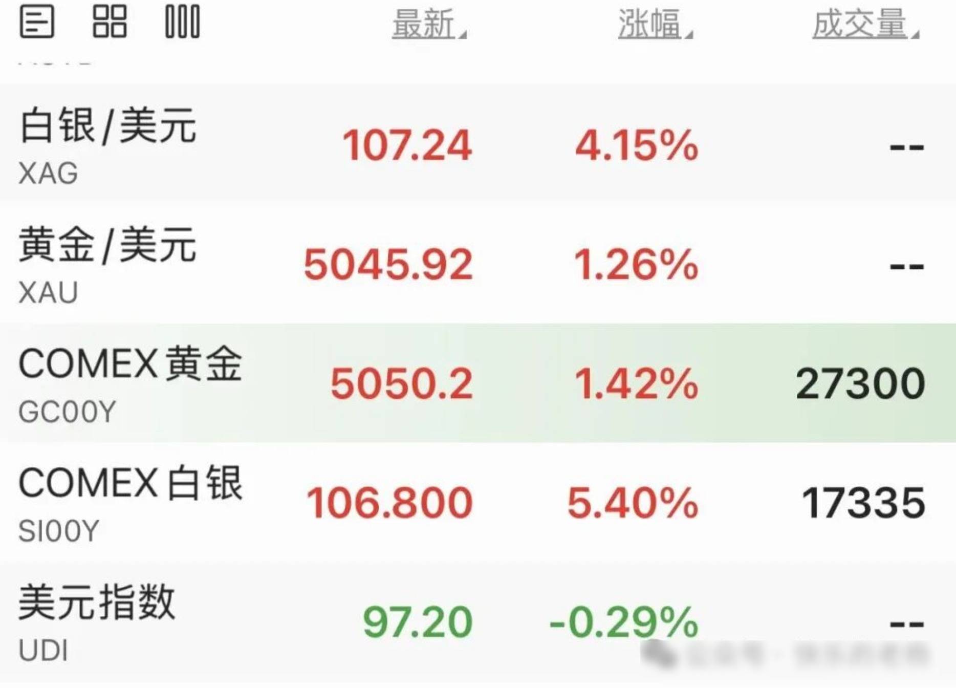 高开大涨,黄金站上世界之巅5000美元,距离2025年10月8日首次突破4000美元关口仅仅100多天。白银突破站上100美元,最高来到107美元上方,1月白银上涨30余美元,涨幅达50%以上。