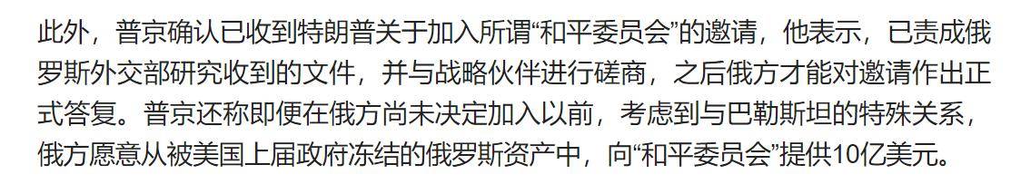 1月21日,克里姆林宫正式确认普京收到了特朗普的邀请函。普京没有立即表态,而是巧妙地打了一手漂亮的太极拳。他说:应战略伙伴的要求,我们需要进一步审慎研究。接着,他话锋一转,立即表示:为了支持加沙的人道主义事务,俄罗斯愿意‘捐赠’10亿美元。但他紧接着补充道:这笔钱美国已经冻结了,我们不再重复支付。什么意思呢?简单说就是:钱在你手上,想动用就去解冻,我这里一分钱不花。这话说得不仅漂亮,而且直接把美国的尴尬处境暴露无遗。