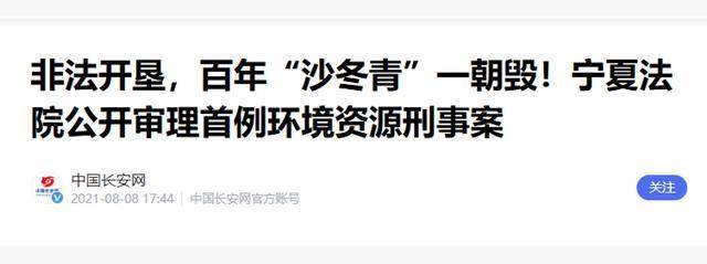 信息来源:中国长安网非法开垦,百年“沙冬青”一朝毁!宁夏法院公开审理首例环境资源刑事案 2021-08-08
