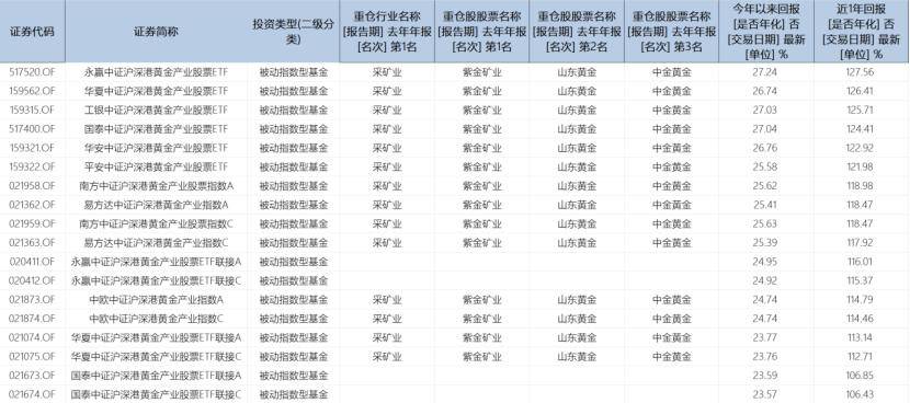 黄金股ETF同样表现亮眼。18只黄金主题相关被动指数型基金,今年以来回报率均超过23%,近一年回报率均超过106%,最高回报率达127.56%,前三大重仓股分别为紫金矿业、山东黄金、中金黄金。