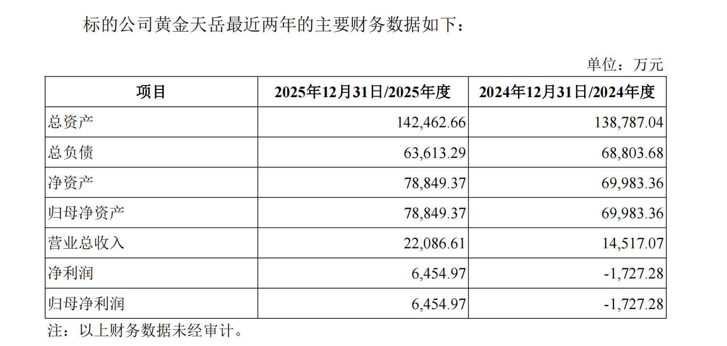 其中,黄金天岳主要从事万古矿区的矿权整合、勘探,以及部分金矿的采选及销售,主要产品为金精矿。黄金天岳2024年度与2025年度总营收分别为1.45亿元、2.21亿元;归母净利润分别为-1727.28万元、6454.97万元,同比扭亏为盈。截至2025年底,其总资产超过14亿元。