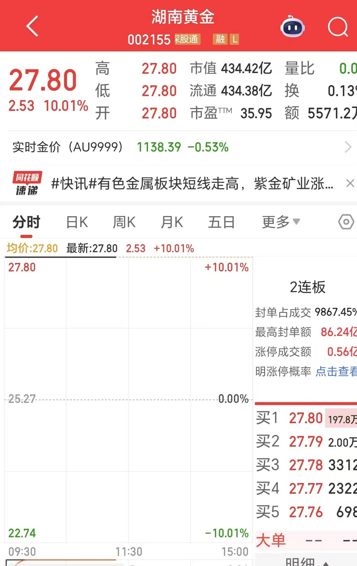 1月27日,湖南黄金(002155.SZ)再次“一字”涨停。截至上午收盘,其股价报27.80元/股,市值为434.42亿元。