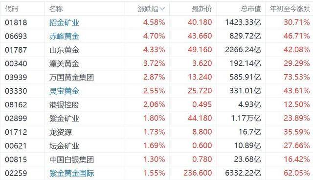 国际金价续涨再创新纪录,港股市场黄金股走强,其中,招金矿业、赤峰黄金、山东黄金涨超4%,潼关黄金涨近3%,万国黄金集团、灵宝黄金、港银控股涨超2%,紫金矿业、龙资源、坛金矿业、中国白银集团、紫金黄金国际涨超1%。值得注意的是,赤峰黄金、山东黄金、灵宝黄金均创出历史新高。