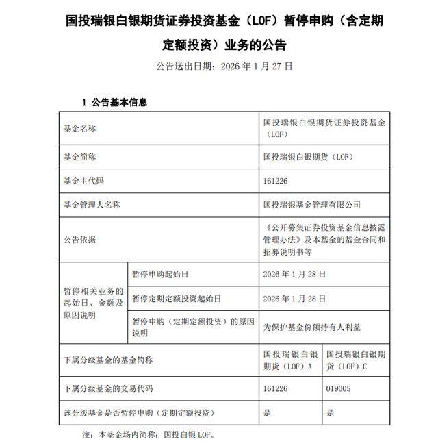1月26日,国投白银LOF公告,将于1月28日起暂停申购(含定期定额投资)业务。