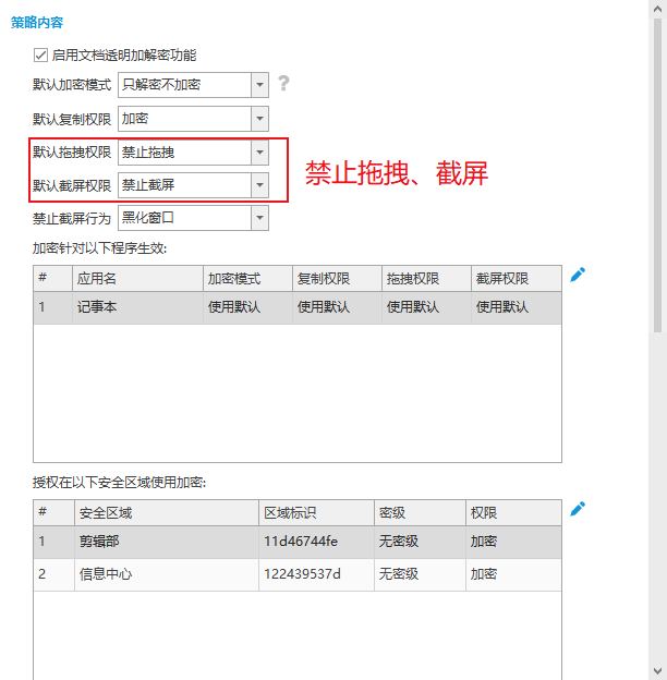 禁止使用PrintScreen、Snipaste等工具截取加密文件内容,可设置“仅禁止以下程序截屏”(如仅禁止企业微信、QQ截屏);禁止将加密文件拖拽至未加密窗口,防止数据通过拖拽方式泄露。