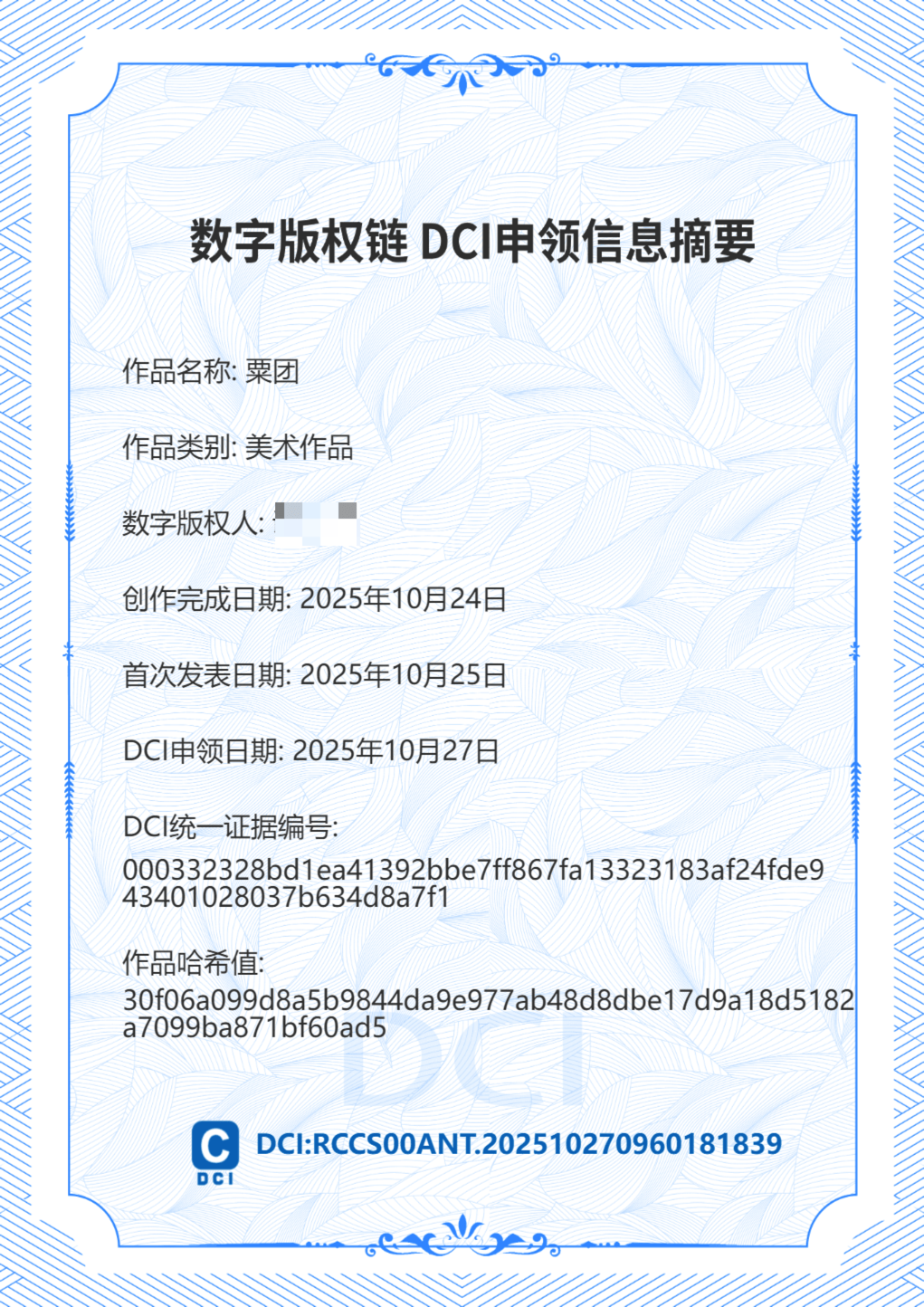 传统版权登记方式费用高、等待周期长,通过DCI登记,用户能高效快速进行作品版权存证,并获得作品存证证书,让创作者享受高效便捷的版权登记服务,降低其线下确权登记的时间成本和人力成本。
