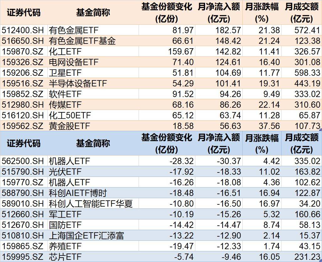 行业主题上看,有色、化工等相关ETF被资金看好,而机器人、光伏相关ETF被资金抛售。