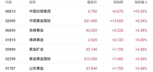 财联社1月26日讯(编辑 胡家荣)受益于多重利好刺激,港股黄金股集体走强。截至发稿,中国白银集团(00815.HK)涨10.29%、中国黄金国际(02099.HK)涨6.24%、赤峰黄金(06693.HK)涨5.58%、珠峰黄金(01815.HK)涨5%、紫金矿业(02899.HK)涨4.26%。