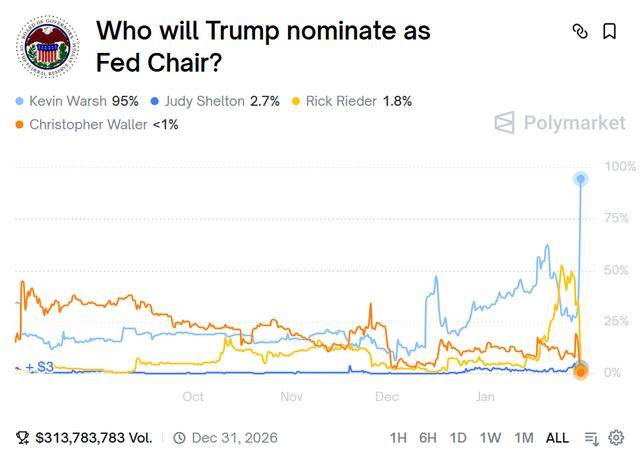 作为日内下一个热门议题,美国总统特朗普曾预告将在周五官宣美联储新主席的提名。热门预测市场Polymarket数据显示,曾在2008年金融危机期间任职于美联储的前美联储理事凯文·沃什(Kevin Warsh)快速跃升为最被看好的人选。虽然沃什近期发表过一些鸽派言论,但市场依然记得他曾是美联储内部的偏鹰派的人士。