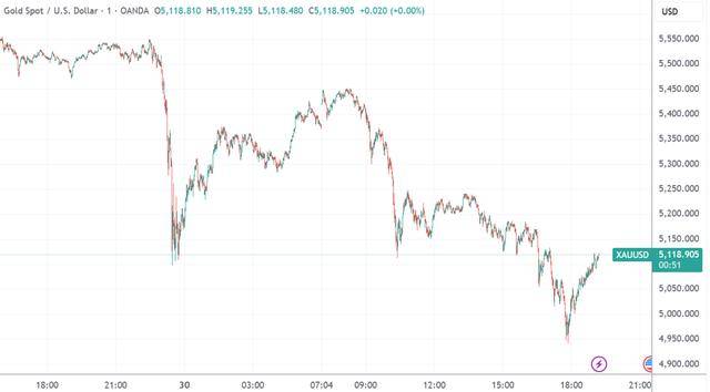 。虽然随后又回升至5400美元上方,但剧烈的波动已经显著加剧市场的紧张情绪。白银也从每盎司120美元跳水至108美元,随后又回升至118美元。