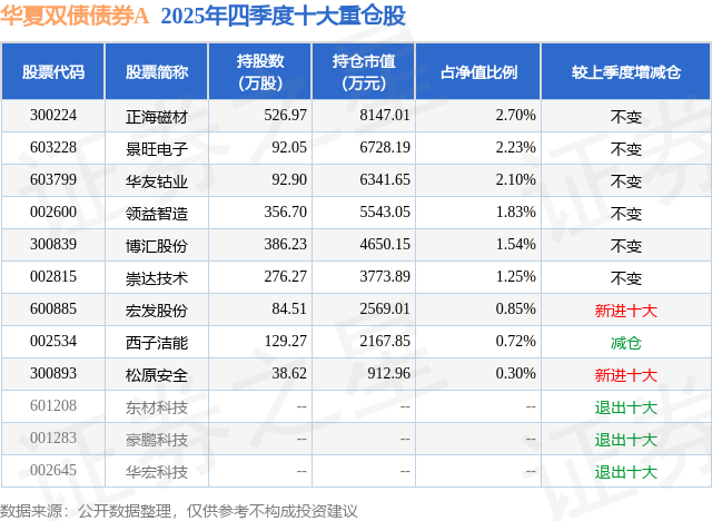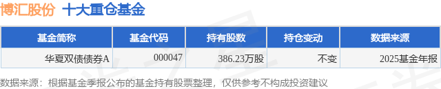 根据2025基金年报公募基金重仓股数据,重仓该股的公募基金共1家,其中持有数量最多的公募基金为华夏基金的华夏双债债券A。华夏双债债券A目前规模为20.94亿元,最新净值2.2022(1月30日),较上一交易日下跌1.72%,近一年上涨21.45%。该公募基金现任基金经理为柳万军。柳万军在任的基金产品包括:华夏纯债债券A,管理时间为2017年9月8日至今,期间收益率为36.69%;华夏永康添福混合A,管理时间为2019年7月15日至今,期间收益率为94.39%;华夏鼎清债券A,管理时间为2020年12月3日至今,期间收益率为23.08%。