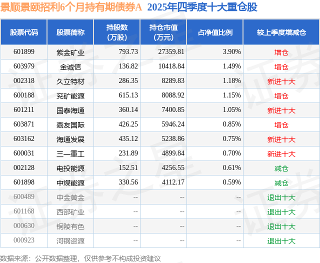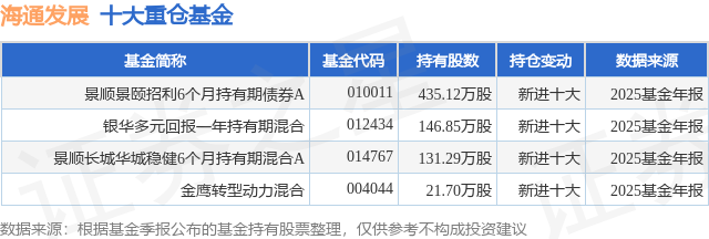 根据2025基金年报公募基金重仓股数据,重仓该股的公募基金共4家,其中持有数量最多的公募基金为景顺长城基金的景顺景颐招利6个月持有期债券A。景顺景颐招利6个月持有期债券A目前规模为62.93亿元,最新净值1.3272(1月30日),较上一交易日下跌0.52%,近一年上涨13.33%。该公募基金现任基金经理为董晗 李怡文 邹立虎。李怡文在任的基金产品包括:景顺长城景颐双利债券A,管理时间为2021年4月30日至今,期间收益率为27.65%;景顺长城安泽回报一年持有混合A,管理时间为2021年4月30日至今,期间收益率为45.72%;景顺景颐嘉利6个月持有期债券A,管理时间为2021年6月16日至今,期间收益率为25.87%。董晗在任的基金产品包括:景顺长城景颐双利债券A,管理时间为2020年10月30日至今,期间收益率为34.22%;景顺景颐嘉利6个月持有期债券A,管理时间为2020年10月30日至今,期间收益率为33.42%;景顺长城景气成长混合A,管理时间为2021年6月15日至今,期间收益率为56.95%。邹立虎在任的基金产品包括:景顺长城安盈回报一年持有混合A,管理时间为2021年11月16日至今,期间收益率为56.52%;景顺长城景盛双息收益债券A,管理时间为2022年1月29日至今,期间收益率为26.18%;景顺长城华城稳健6个月持有期混合A,管理时间为2022年3月12日至今,期间收益率为35.52%。