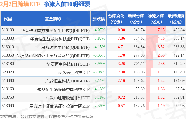 当日有47只跨境ETF基金出现资金净流入,其中净流入排首位的是华泰柏瑞南方东英恒生科技(QDII-ETF)(513130),份额增加了10.0亿份,净流入额为7.15亿元。