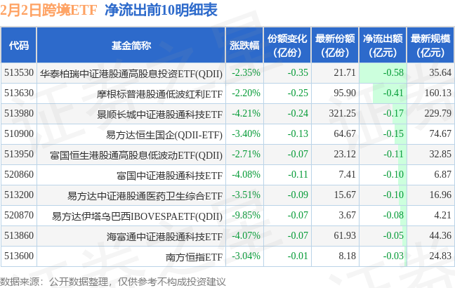 当日有16只跨境ETF基金出现资金净流出,其中净流出排首位的是华泰柏瑞中证港股通高股息投资ETF(QDII)(513530),份额减少了3550.0万份,净流出额为5773.29万元。