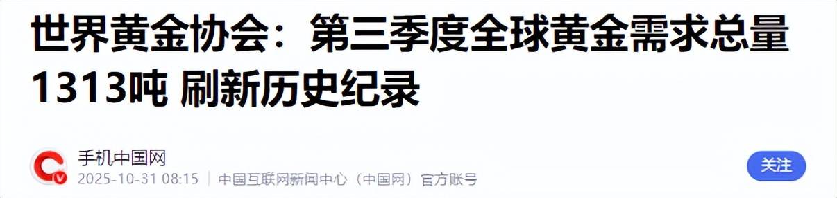 2025年第三季度,全球黄金总需求达到1313吨,金额达到了惊人的1460亿美元,创下了单季度历史记录。