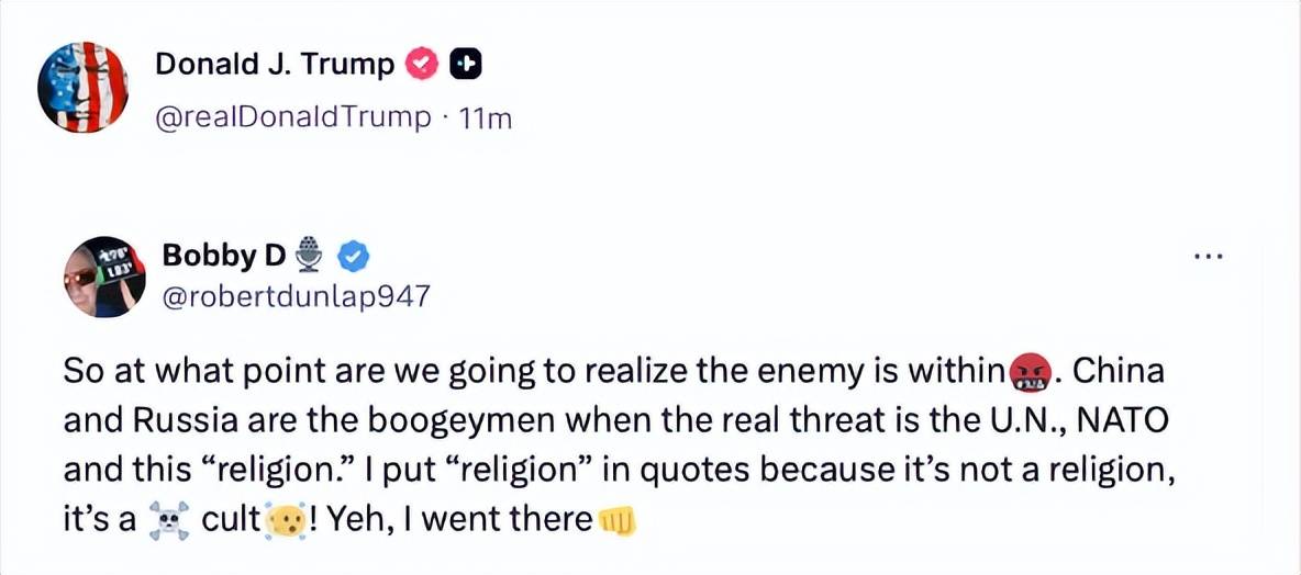 日前,特朗普在社交媒体平台上,转发了一条内容非常直白的帖子,大意就是:美国真正的问题不在外部,中国和俄罗斯只是吓小孩的那种“夜魔”,真正的威胁是联合国、北约,还有那套被奉为信仰的全球主义。