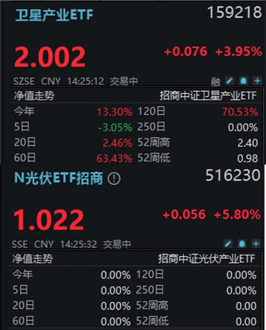 2月3日,“太空光伏”概念持续发酵!截至14时23分,卫星产业ETF(159218)、N光伏ETF招商(516230)分别涨4.15%、5.80%。