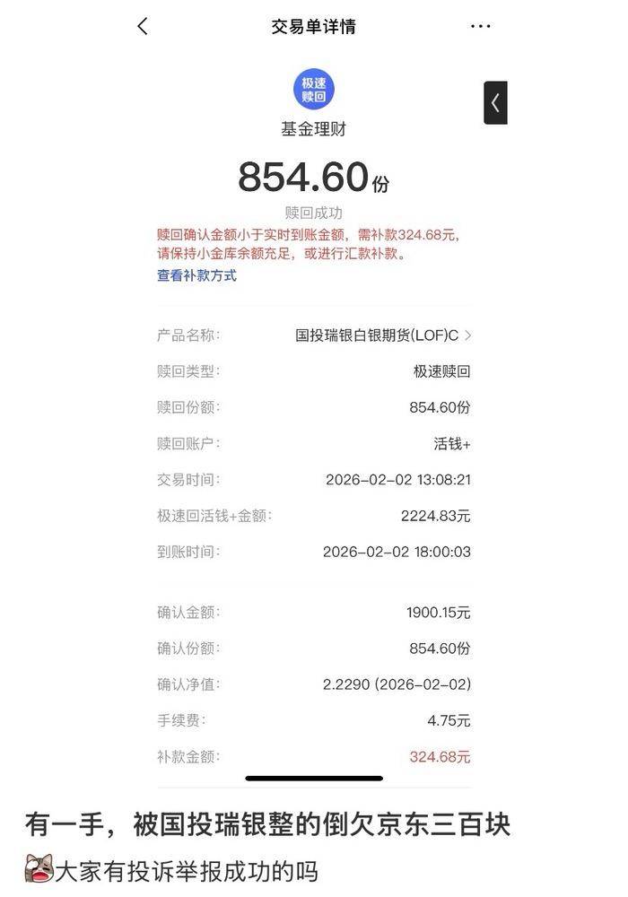 “本想赎回基金止损,不料钱没拿到,反而倒欠京东金融300多元。”2月3日,一位国投瑞银白银期货LOF的投资者在小红书晒出交易记录,引发众多同类投资者的共鸣。