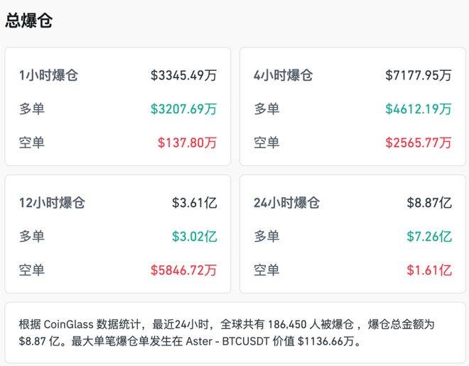 根据CoinGlass数据统计,最近24小时,全球共有18.64万人爆仓,爆仓总金额为8.87亿美元。最大单笔爆仓单发生在Aster - BTCUSDT 价值为1136.66万美元。