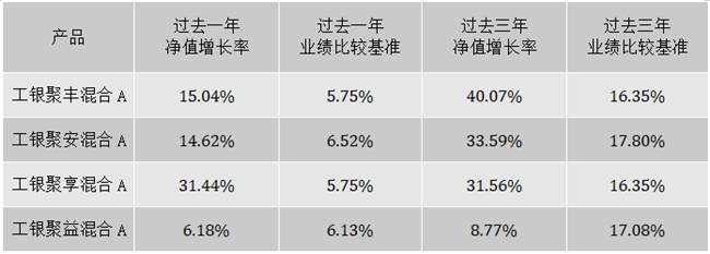 风险提示:基金管理人依照恪尽职守、诚实信用、谨慎勤勉的原则管理和运用基金财产,但不保证基金一定盈利,也不保证最低收益。基金过往业绩不预示未来表现,基金管理人管理的其他基金的业绩并不构成基金业绩表现的保证。工银聚丰混合基金、工银聚享混合基金为混合型基金,预期收益和风险水平低于股票型基金,高于债券型基金与货币市场基金。工银聚安混合基金、工银聚益混合基金为混合型基金,预期收益和风险水平低于股票型基金,高于债券型基金与货币市场基金,如果投资港股通投资标的股票,还需承担港股通机制下因投资环境、投资标的、市场制度以及交易规则等差异带来的特有风险。基金有风险,投资者投资基金前应认真阅读《基金合同》、《招募说明书》、《基金产品资料概要》及更新等法律文件,在全面了解产品情况、费率结构、各销售渠道收费标准及听取销售机构适当性意见的基础上,选择适合自身风险承受能力的投资品种进行投资,基金投资须谨慎。
