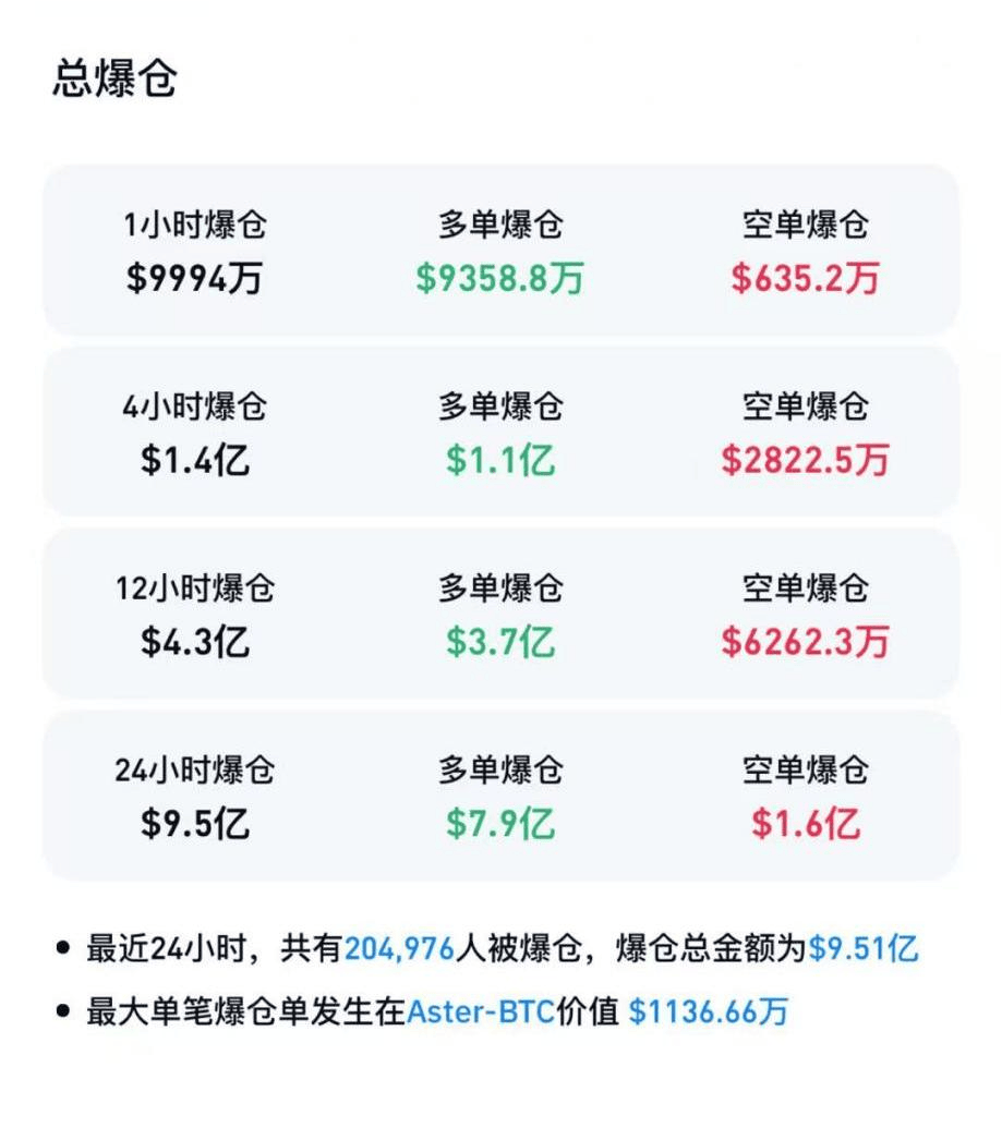 Coinglass数据显示,最近24小时内, 加密货币市场超20万人被爆仓,爆仓总金额为9.51亿美元,其中,多单爆仓金额为7.9亿美元,空单爆仓金额为1.6亿美元。
