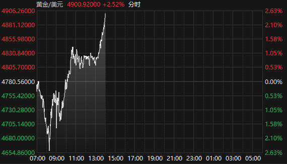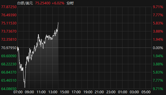 据Choice数据,2月6日午后,国际现货黄金、白银快速拉升,截至14:00,现货黄金报4900.92美元/盎司,日内涨2.52%;现货白银报75.25美元/盎司,日内涨6.02%。