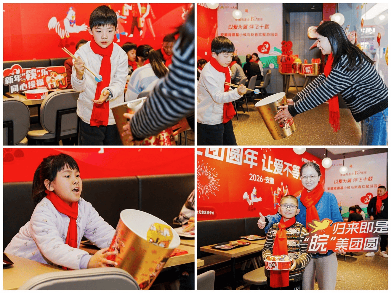 同时,中国儿基会肯德基小候鸟基金在全国不同城市的二十多个肯德基餐厅精心筹备了融合当地民俗特色与美好祝福的“新春欢聚游园会”系列活动,不仅拉近了小候鸟家庭之间的物理距离,更在情感层面搭建紧密的温情纽带。熟悉的肯德基餐厅摇身一变,成为一座座传递节庆温情的温馨驿站,让“小候鸟”深切感受浓厚的节日氛围。孩子们在游戏中尽情欢笑,领略中华文化的独特魅力,在欢声笑语中收获了陪伴与温暖。一张张灿烂的笑脸,映出幸福温暖的年味,无疑是这个春节最美的年画。