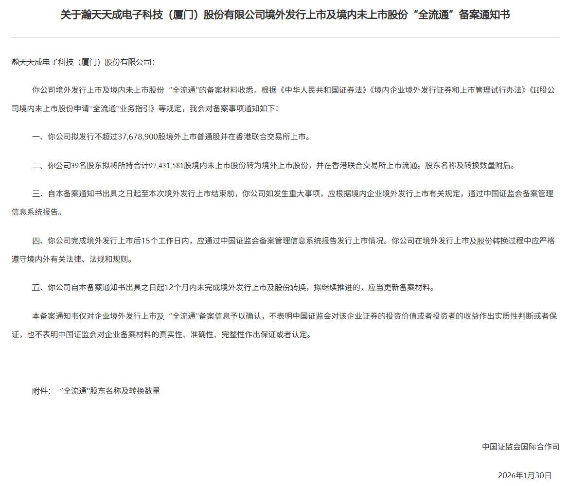 智通财经APP获悉,2月6日,中国证监会国际合作司发布《关于瀚天天成电子科技(厦门)股份有限公司境外发行上市及境内未上市股份“全流通”备案通知书》。公司拟发行不超过37,678,900股境外上市普通股并在香港联合交易所上市。公司39名股东拟将所持合计97,431,581股境内未上市股份转为境外上市股份,并在香港联合交易所上市流通。