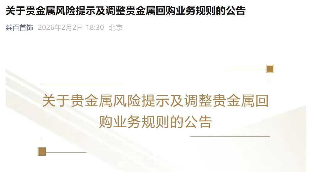 2月2日,菜百首饰发布公告称,自2月6日起,在周六、周日及法定节假日等上海黄金交易所非交易日期间,将暂停办理贵金属回购业务。自2月6日起,在业务办理时间内,菜百将对回购业务进行限额管理,限额类型包括全量或单一客户单日回购上限、单笔回购总量上限等,并进行动态设置。
