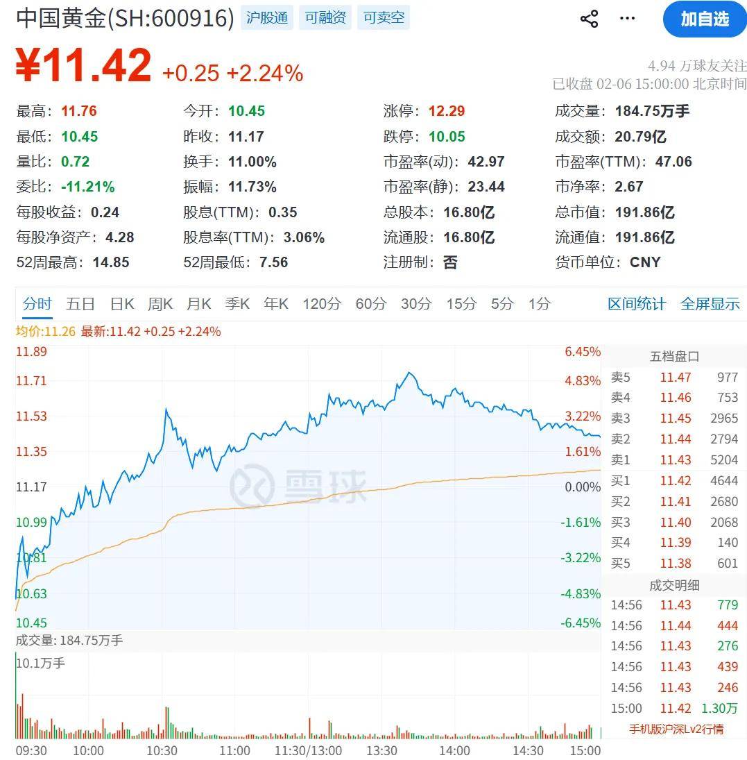 中国黄金于2021年登陆上交所主板市场。截至2月6日收盘,中国黄金报11.42元/股,总市值为191.86亿元。