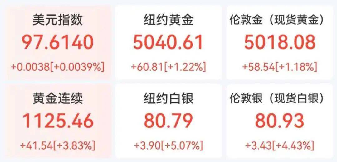 现货黄金涨超1%,报5018.08美元/盎司,现货白银涨超4%,报80.93美元/盎司。