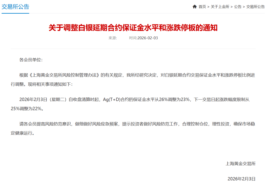其中白银期货部分,2026年2月3日(星期二)自收盘清算时起,Ag(T+D)合约的保证金水平从26%调整为23%,下一交易日起涨跌幅度限制从25%调整为22%。