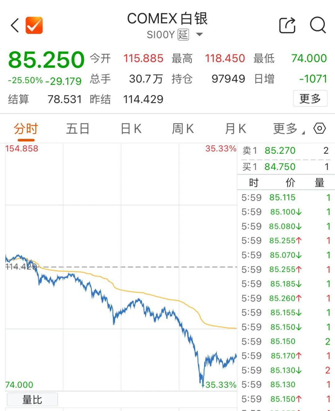 现货白银一度暴跌超过36%,创出历史最大日内跌幅。截至收盘,现货白银下跌26.37%,报85.17美元/盎司。COMEX白银期货跌25.50%,报85.25美元/盎司。