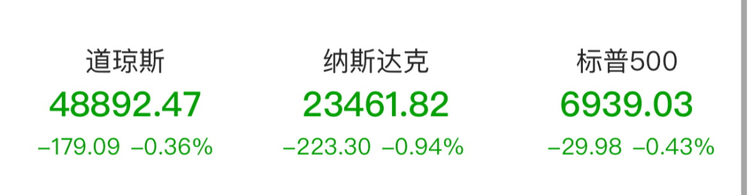 美股三大指数全部收跌,道琼斯指数跌幅0.36%,报48892.47点;标普500指数跌幅0.43%,报6939.03点;纳斯达克综合指数跌幅0.94%,报23461.82点。