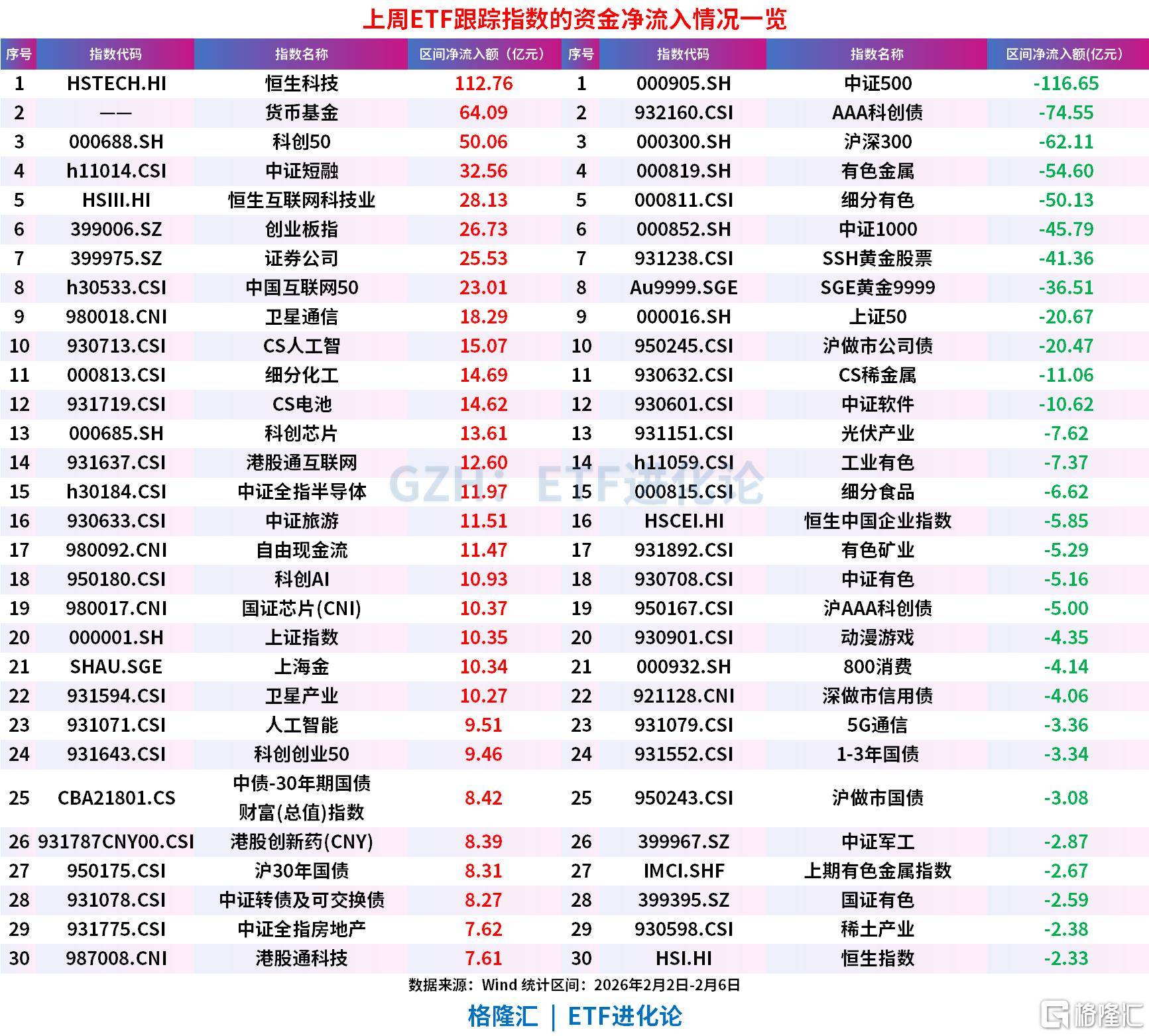 中证500、AAA科创债、沪深300、有色金属、细分有色、中证1000、SSH黄金股票、SGE黄金9999上周分别净流出116.65亿元、74.55亿元、62.11亿元、54.60亿元、50.13亿元、45.79亿元、41.36亿元、36.51亿元。
