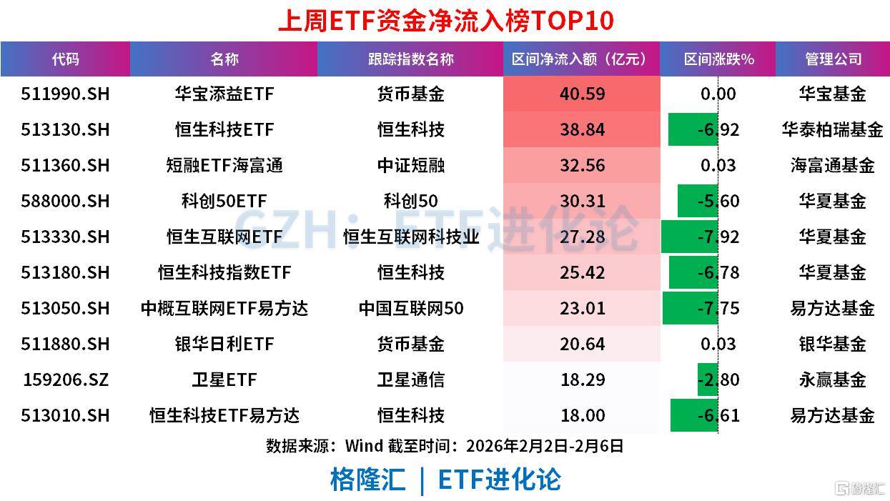 ETF方面,华宝添益ETF、恒生科技ETF、短融ETF海富通、科创50ETF、恒生互联网ETF、恒生科技指数ETF上周分别净流入40.59亿元、38.84亿元、32.56亿元、30.31亿元、27.28亿元、25.42亿元。